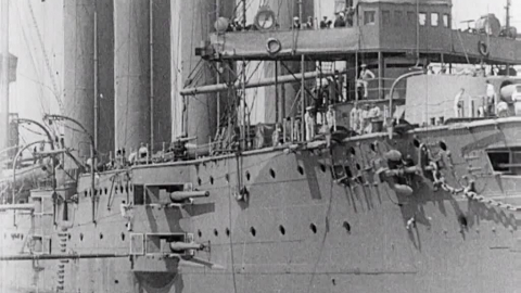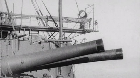 Britannia rules the waves! Scenes of a battleship at gunnery practice, with fine shots of the guns firing.
