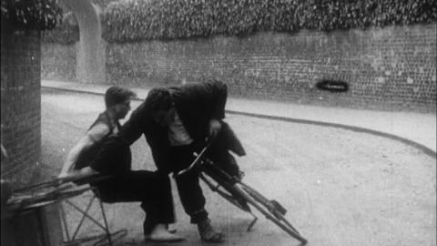 A clumsy oversized cyclist causes chaos in this knockabout silent comedy.