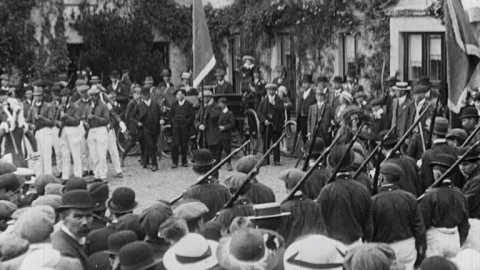 Sir Edward Carson speeds through an inspection of members of the Ulster Volunteer Force before hot-footing it to London for urgent talks on the Home Rule crisis.