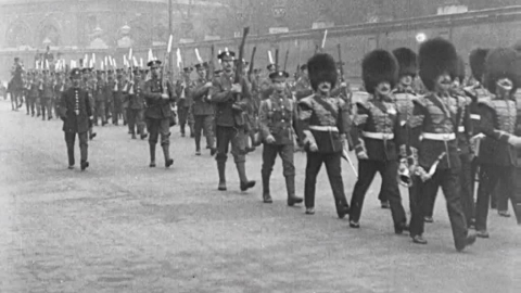 Colonial troops greet London's new Lord Mayor in a patriotic wartime ceremony.