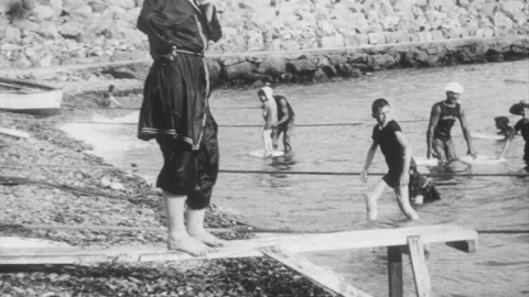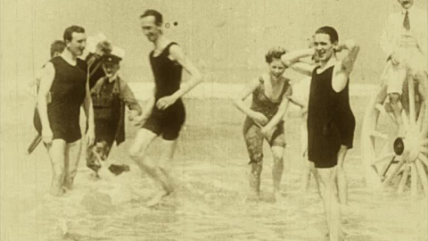 Blissful scenes of tourists arriving by boat and then sea bathing on a beach in the Venetian lagoon.