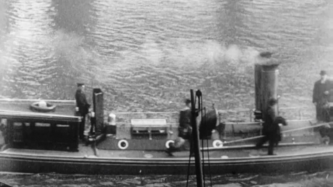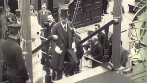 A handsome steam launch ferries the future PM downriver to the luxury yacht 'Enchantress'.