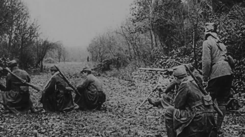 A small band of French soldiers take to the woods of the Argonne in this military exercise - probably staged for the camera.