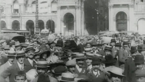 In Milan's Piazza del Duomo a crowd gathers to hear news of Italy's entry into WWI.