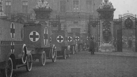 Travelling with the Red Cross ambulance flotillas through Montereau in central northern France.