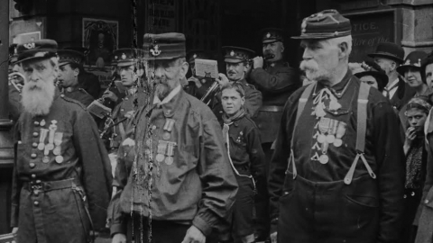 Veterans of the 1867 Garibaldi campaign lead a WWI recruiting march in Walham Green near Fulham Broadway.