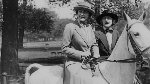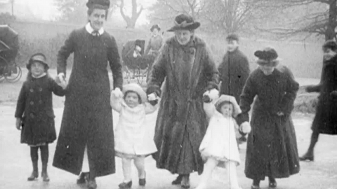 Nannies and nippers compete with seasoned skaters on a frozen pond near London in this charming wintery newsreel.
