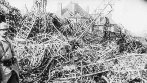 French soldiers guard the wreck of the L.39 Zeppelin, brought down by Brought down in the Boulevard Gambetta, Compiegne