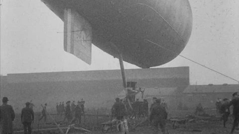 A military airship of the S.S.T. series is pulled out of a hangar and prepared for take-off.