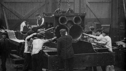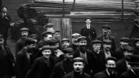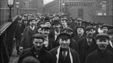 An all-male Edwardian crowd is filmed leaving work in the north western town.