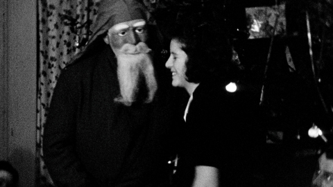 It's an austerity Christmas from 1948 with a scary looking Santa Claus dishing out the presents and the kisses.