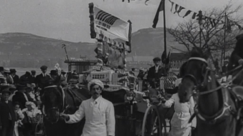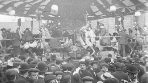 For millions of working Britons for much of the Victorian era, leisure time was a distant dream. But by the dawn of the 20th century wages had risen for most. An entire industry sprang up to serve workers with more time on their hands and money in their pockets. Film was a growing part of that industry. Mitchell and Kenyon were at home in a world of showmen, fetes and fairgrounds, where their films were often shown. Fairgrounds feature in several films, as do carnivals and processions, agricultural shows, seaside resorts and an assortment of wonderfully eccentric local customs, from egg rolling to well dressing. These enchanting films give a very selective account of the British at play - M&K favoured public events with large potential audiences for their screenings. They show that all classes relished their precious leisure as much as we do today - even if the average Edwardian's idea of relaxation was a little less laid back than ours. Digitisation of this collection was funded by The National Lottery.