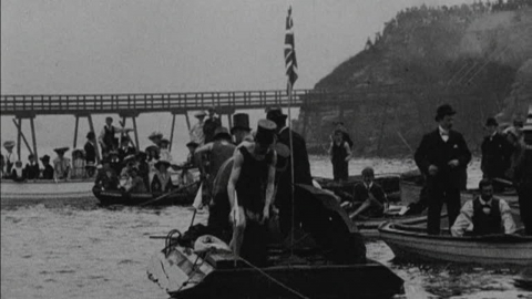 Edwardian crowds enjoy a fancy-dress swimming race.