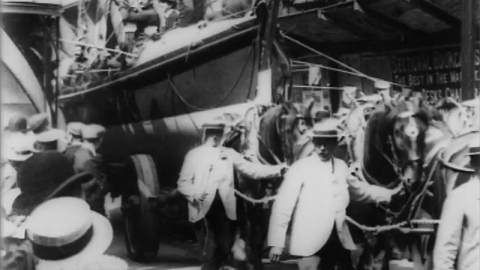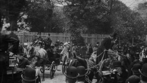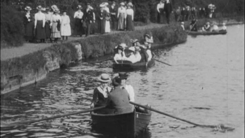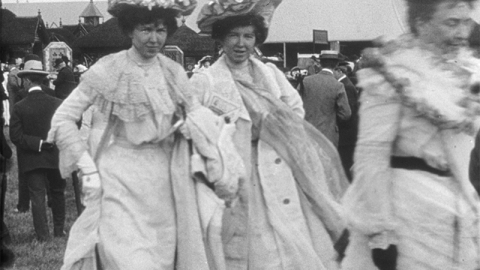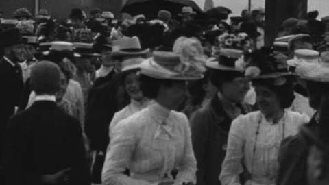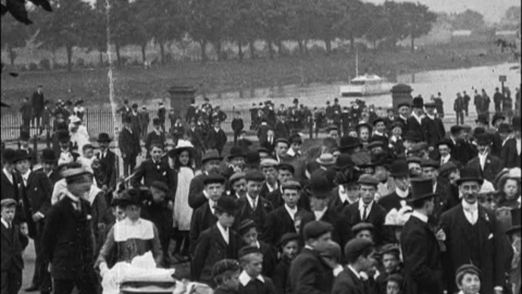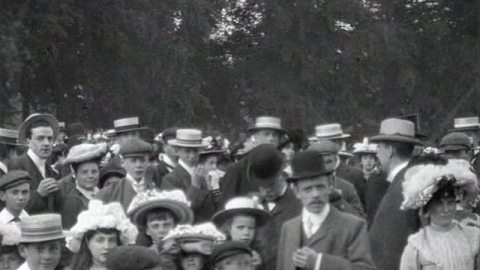 A camera pan through the park reveals teaming crowds and changing fashions in Edwardian hatwear.
