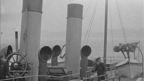 Edwardian holidaymakers on pleasure boats Deerhound and Greyhound as they ply the coast off Blackpool.