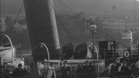 Welcoming crowds greet the arrival of a steamer to the Isle of Man, seen from a stunning perspective on deck.