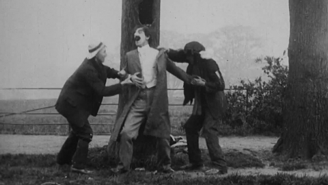 A Jewish man with a bag of gold is targeted by roadside robbers in this early comedy short reflecting antisemitic stereotypes