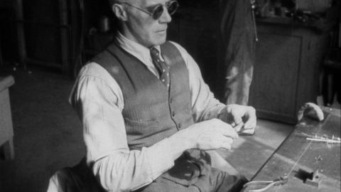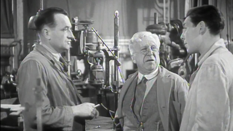 Women on the factory floor? An engineer needs convincing that war work is a feminine pursuit.