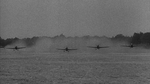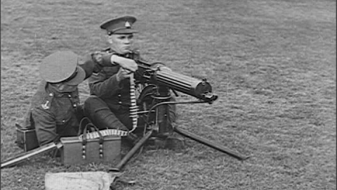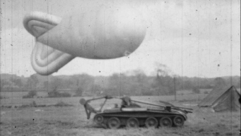 Amateur footage of the home guard on patrol and at ease in the fields outside London, where anti-tank weapons are tested in front of suburban houses.