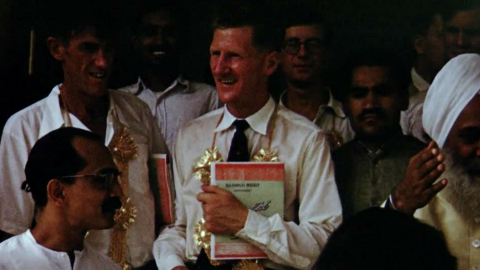 Colour footage shot in Delhi on the 1953 Everest expedition's return. Includes group receiving gold medals from Nehru and an official welcoming reception by the Indian Government.