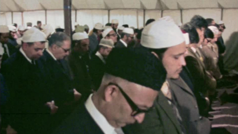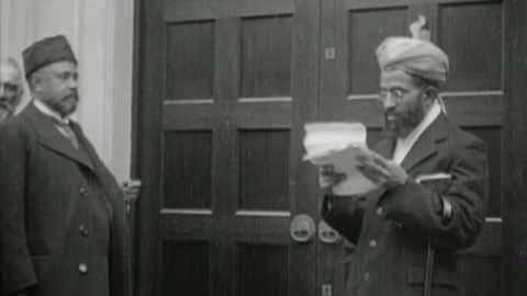 The UK's first purpose-built mosque welcomes a huge crowd of worshippers - and newsreel cameras!