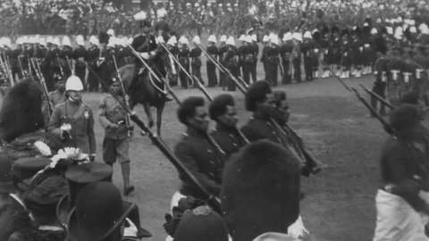 Queen Alexandra reviews Indian and other colonial troops in this early film by the Hepworth company
