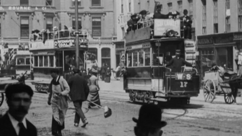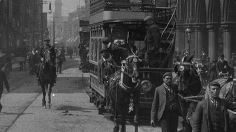 Much of Edwardian life was lived in densely packed public spaces. The industrial revolution had swollen the populations of Britain's towns and cities, and the evidence was there to be seen - and filmed - on the streets. 'Street scenes' were a staple of early filmmaking, and many of Mitchell and Kenyon's, restored from original negatives, are particularly stunning. They teem with life and historical detail, revealing how our ancestors behaved, dressed and moved in public and how their towns and cities were organised. These streets have a bewildering chaos to them. The full onslaught of the motor car still lies ahead, but in a time before traffic lights, the tide of vehicles never lets up: horse-drawn carts, bicycles, omnibuses and trams (some of them electrified). Miraculously, the pedestrians weaving between them always seem to emerge unscathed. We may never hear the sounds of the city - or smell its smells - but the images alone still have the power to astonish. They evoke a society in rapid change: an urbanised, increasingly mobile, consumer Britain not so very different from our own. Digitisation of this collection was funded by The National Lottery.
