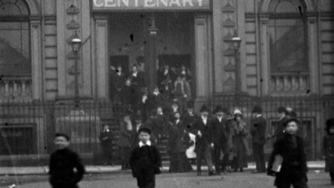 A small crowd bustles outside the now-demolished Centenary Methodist Wesleyan Chapel.