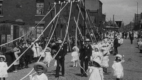 Crowds throng the city streets to see a parade of beautifully turned out children in a festive parade.