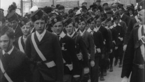 Nurses and soldiers parade for crowds and the camera, with the boys' brigade marching past.