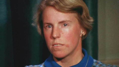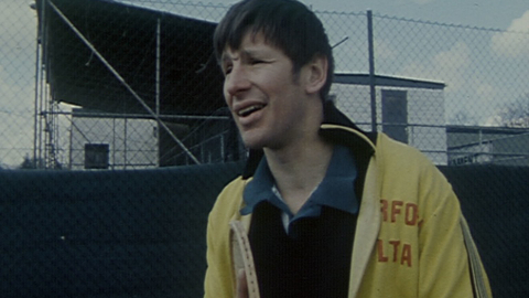Judy Finnigan, early in her career as an Anglia TV reporter, interviewing 'real tennis' pro Brian Church.