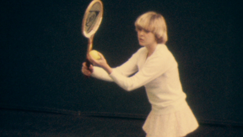 Instructional film offering tips on a variety of tennis strokes, from serving and volleying to backhand and the smash.