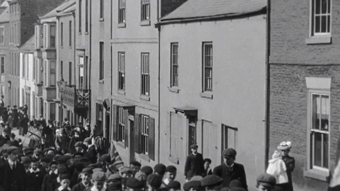 Crowds celebrate the crowning of George V and his consort Mary on a windy June day in the Lancashire mill town.
