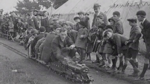A gleaming giant of steam and its cute Lilliputian cousin are an even match in this newsreel battle of the trains