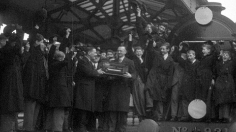 A full size replica of Robert Stephenson’s world famous locomotive, The Rocket, steams up a 1920s crowd at the North Road Works in Darlington.
