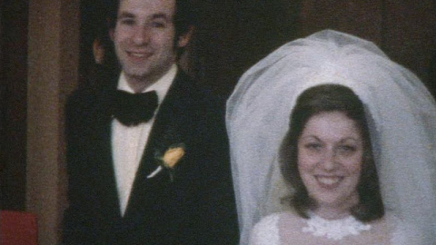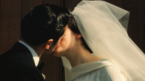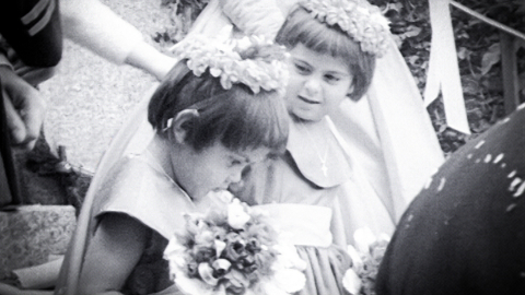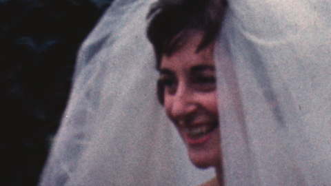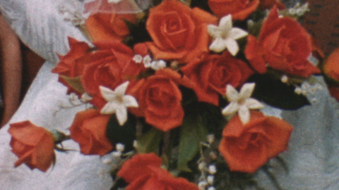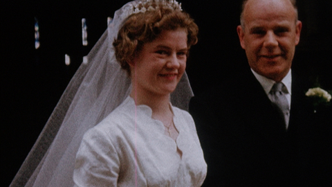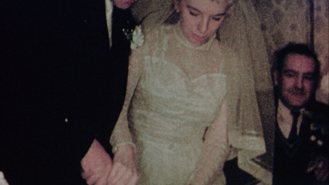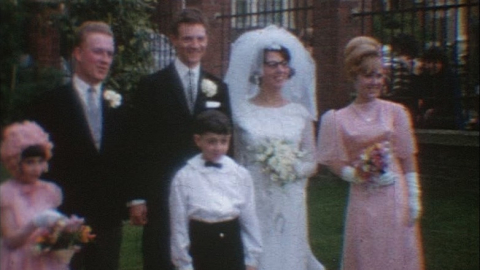 Flower girls, kisses and 60s fashions as a couple go up the aisle in this home move of a family wedding in the 1960s.
