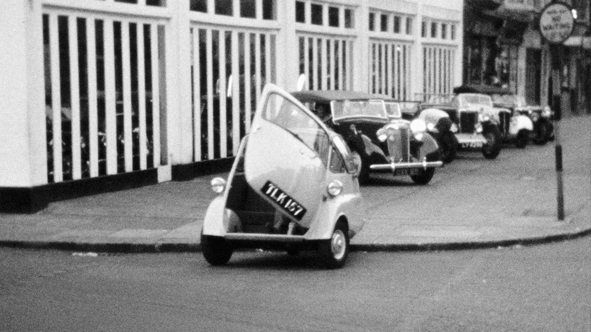 An elegantly-dressed foursome hurriedly crosses a busy Chiswick High Road before engaging in what looks like an uncoordinated car heist outside the Chequered Flag showroom. The driver in the Isetta - a popular bubble car of the period - manages to get going first, but not without a few hiccups. His fellow racers struggle on, attempting to start the stubborn engines while oblivious passers-by stumble into shot. The film features notable local Graham Warner.