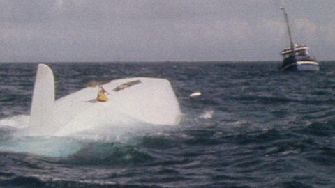 Singer Simon Le Bon and his rescuer Navy diver Larry Slater are interviewed in Falmouth after the capsizing of the yacht Drum.