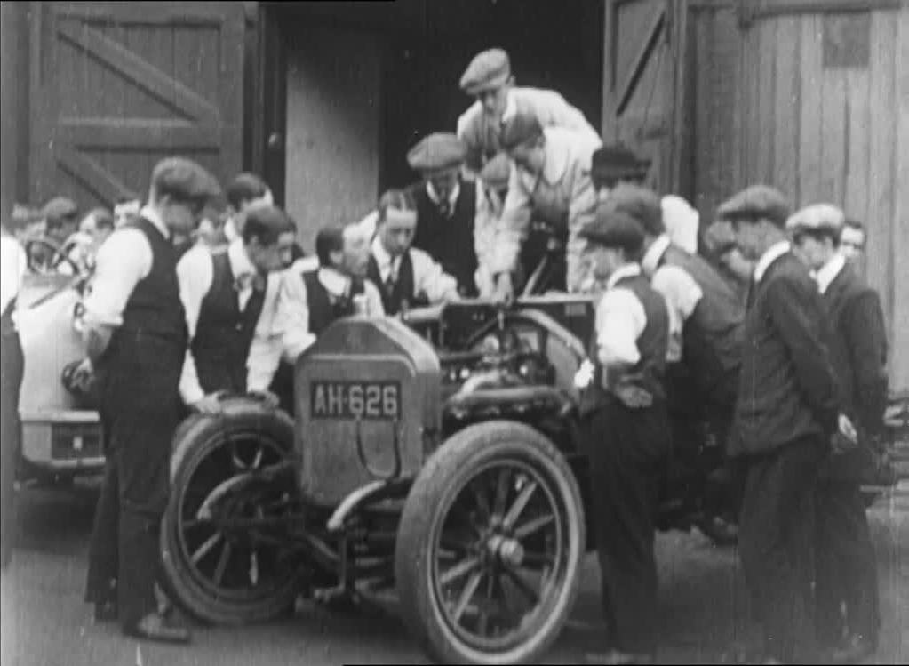 In 1914 Britain still relied heavily on horse power, and the young men seen peering over the car's engine in this film would very likely never have driven a car before.