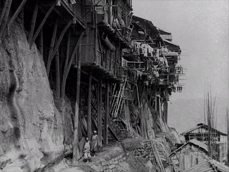 In a film of many contrasts, the precarious dwellings which jut out of the mountainside in this vertical city seem somehow futuristic and ancient at the same time. Those who make a hard living on these steep steps also seem a world away from the Western navy men who are carried on their backs. The jokey intertitles offer a further disparity in making the scenes entertainment for cinema audiences.