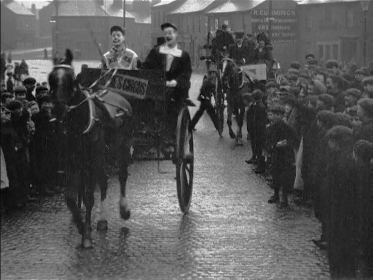 These scenes of the advance guard of a modest circus riding through Carlisle's streets, accompanied by a growing crowd of citizens and children, give us a good idea of the scale of the regional touring circus show. The party includes carriages, two white horses (one carrying a dog), clowns and a band, preceded by a man with a placard advertising entertainments, including a 'Bioscope' (film) show.