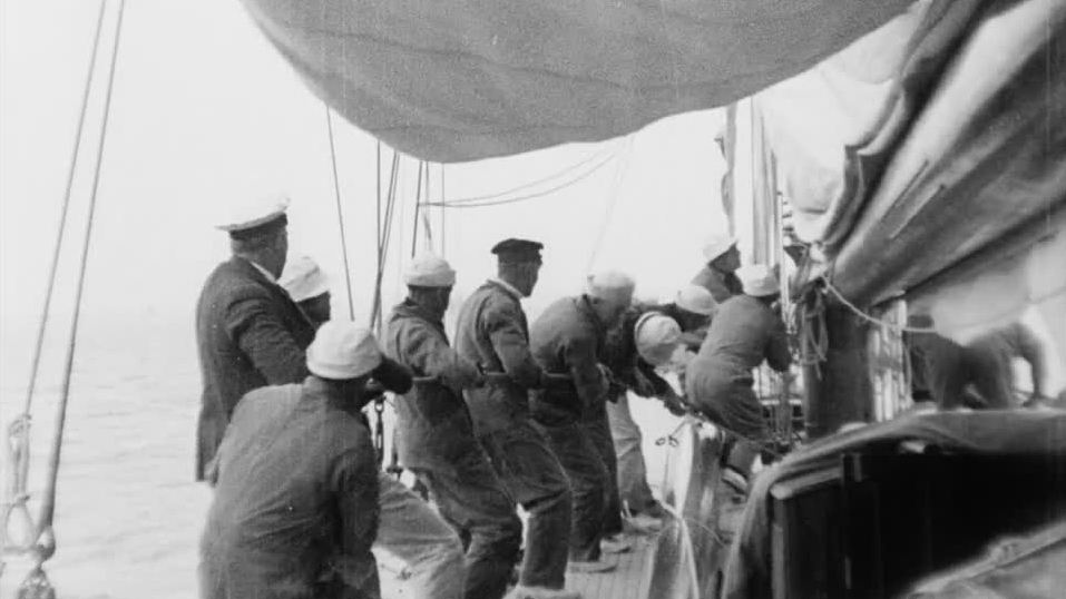 Mind that sail! Topical Budget's cameraman risks a soaking to shoot a tense yachting competition of the Essex coast. There's some fine photography here, giving a real sense of the astonishing speed with which these sleek vessels cut the waters, though the sea mist slightly spoils the longer shots.