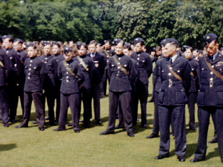 A Drum Service is followed by rare colour footage of Home Guard and ATC cadets on parade in Banstead on Empire Day. These scenes are followed by a cricket match and a number of Armistice Day ceremonies showing civil defence and military personnel marching with members of the British Legion to the War Memorial. Also seen is the presentation of a mobile canteen to women of the British Legion at Guildford's Stoke Park, as well as an outdoor United Youth Service and salute.