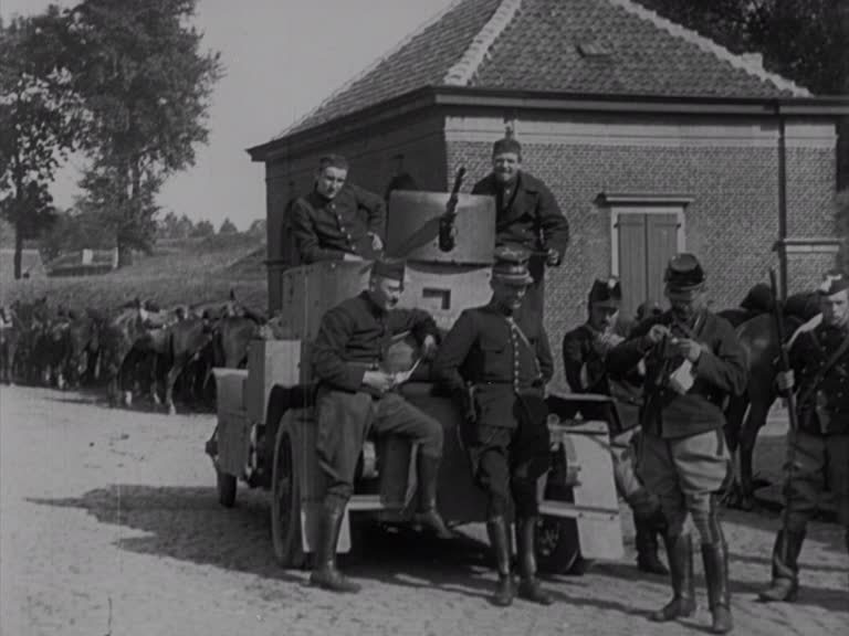 These scenes illustrate the efforts and sacrifices of the Belgian Army in the first months of WWI, massively outnumbered and soon overpowered by German forces. The march past the camera, the proud presentation of an early armoured car, and the shot of artillery among the potato fields might seem relaxed, but the footage of monks loading the ambulance car brings home the impact of war.