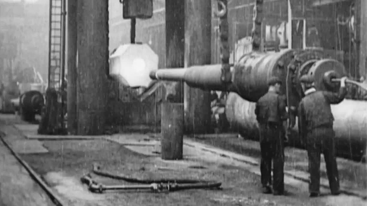 A new weapon is launched in the pre-WWI naval arms race. This striking film illustrates the processes in the casting and manufacture of a 12-inch, 50-calibre naval gun - the kind of gun that would be used on battleships between 1914 and 1918. It was filmed in early 1908 at the factory of Armstrong Whitworth & Co., based in Newcastle-on-Tyne. The scale of the operation from 85,000 kilos of molten steel to the massive form of the finished gun is nicely filmed to showcase its impressiveness.