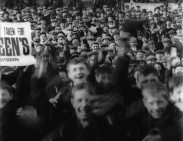 The match drew 1-1, a relief to Blackburn fans: when the teams last met, they lost 3-0. Sheffield's players are wearing red and white striped shirts, easily identifiable even in black and white. A recurring placard reads 'SPECIALLY TAKEN FOR GREEN'S CINEMATOGRAPH', carelessly held upside down at one point. The film was commissioned by showman George Green, who showed it at his travelling fair.