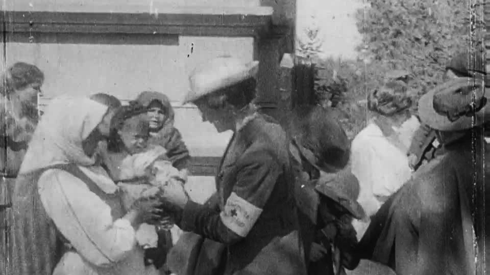 Having suffered endless bombardment by Austrian warplanes during WWI, many Serbians fled to the safety of British bases, where the Red Cross were on hand to provide aid to the many casualties. One third of the total pre-war Serbian population were on the move in 1915. Frontline newsreel images such as this captured and promoted the valuable work undertaken by charitable organisations.