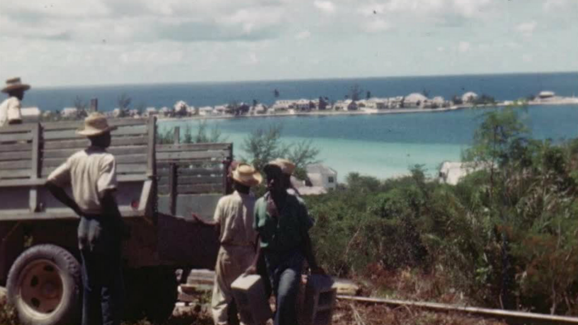 Colour film showing the restoration of a historic house and views in the Bahamas, dating from the mid-20th century. Early scenes perhaps show the aftermath of a storm, with trees ripped from the ground and an upturned boat in the sea. The film shows the complete rebuilding of a house including unloading materials, plastering, bricklaying and framework. Children watch a seaplane land and take-off. A group in masks and a band appear to celebrate outside the property. Film ends showing ‘Buccaneer Hill’ house sign.