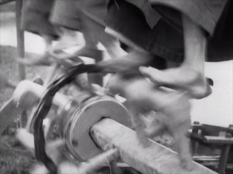 This newsreel item shows Chinese farmers irrigating fields with the aid of an impressive pedal-powered wooden contraption - a traditional method supposedly some 2,000 years old. The camera captures the action from every angle: one expertly framed shot catches a sampan sailing serenely by in the background, while there are plenty of close-ups of the men's pounding feet and smiling faces.