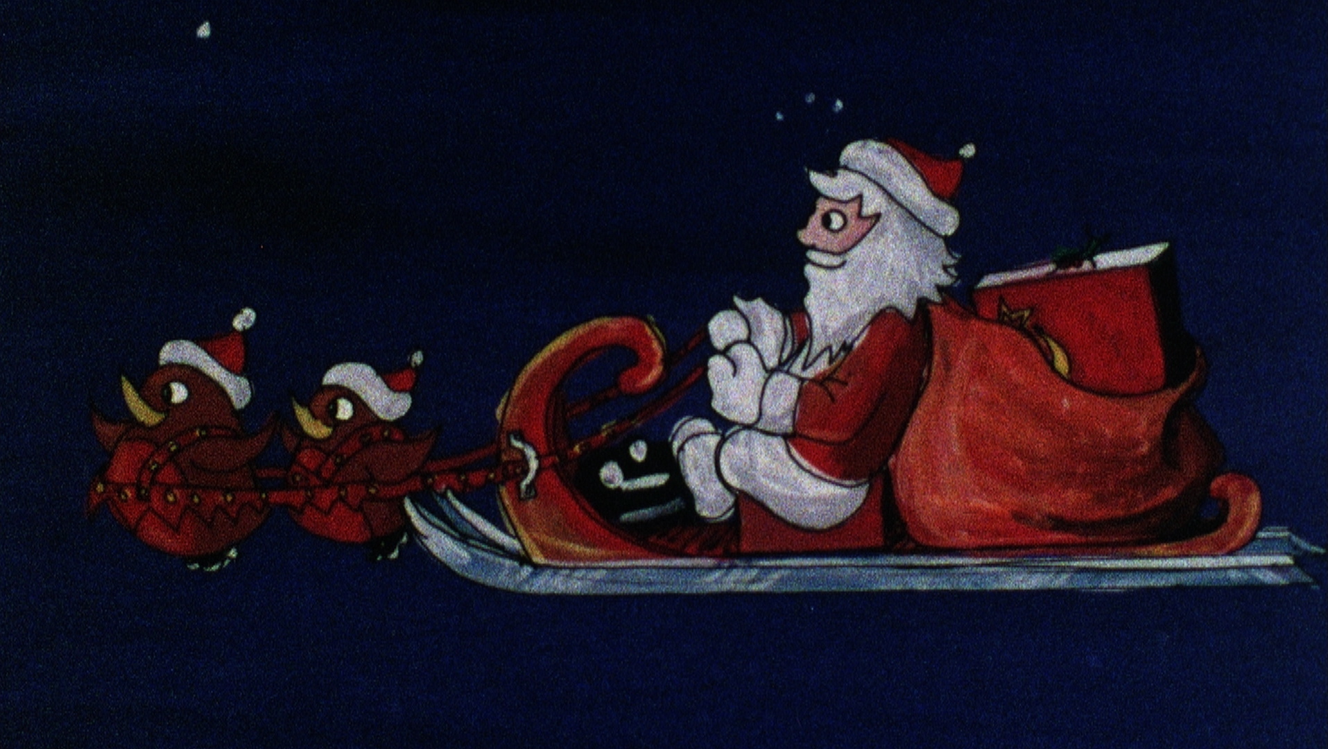 A typically wonderful animation from the award-winning animator Sheila Graber. This animation from 1978 has Santa, with three robin helpers, travelling the world in his sleigh delivering presents. This truly internationalist Santa travels from the Soviet Union to China, Ghana, Egypt, Vietnam and many other countries, before returning home to Iceland – each country identified by its familiar representation and accompanying music.